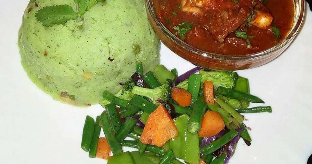 Mukimo is sometimes referred to as “Irio”. It consists of mashed soft corn/ maize, peas, potatoes, and green pumpkin leaves or fig-leaf gourd leaves (“Kahurura”). The mix of all these is brought to a boil and then mashed with margarine or butter once the potatoes are soft. It is then fried with some onions and tomatoes (optional).