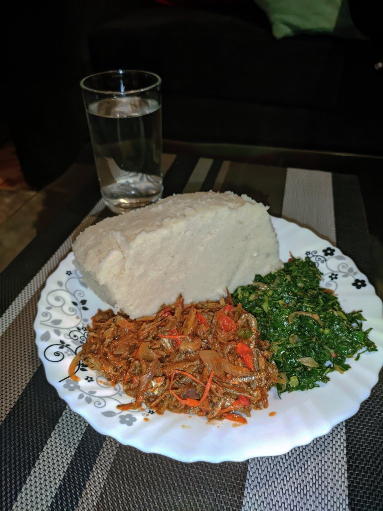 Ugali This is a staple food in many Kenyan households. It is white corn flour that is poured into hot water and mixed thoroughly into a thick block. It is then eaten with beef stew/ “Nyama Choma” or “Sukuma Wiki” (Kales), or even Kales mixed with Spinach. You can also add “Kachumbari” for an even better flavour!
