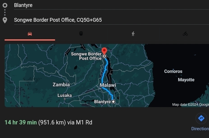 Although Malawi looks very small on an atlas map. It’s quite an unexpectedly long journey . Taking a bus from the commercial city of Blantyre to the border town of Songwe. The journey takes about 15 hours covering a distance of about 950 kilometres using the M1 highway. Captain Tours bus company is only coach operating a direct service. It passes through Lilongwe, Mzuzu, Karonga, Kasungu, Mzimba, etc